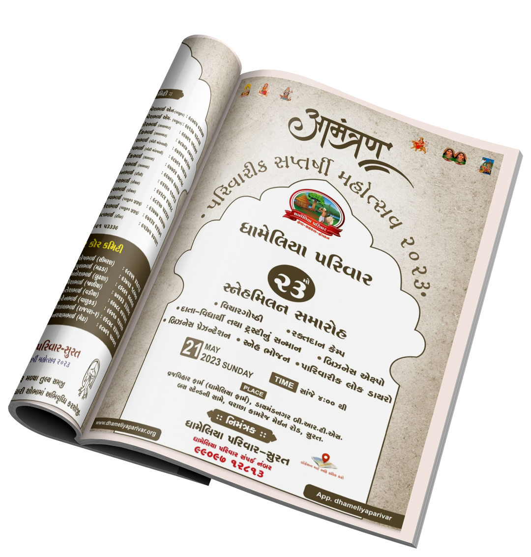 Dhameliya Parivar Parivarik Panchamrut Mahotsav 2022 organized by Parivar Surat is held on 05/06/2022 on Sunday from 4:00 pm. So on this auspicious occasion, we cordially invite all of you to come with your family.